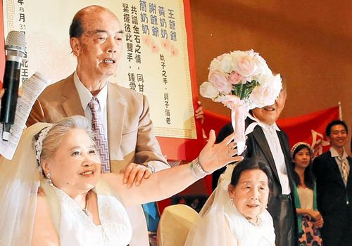 兩對超過50年的長輩舉辦“世紀婚禮”,高齡8旬的謝爺爺與老伴簡奶奶做到“執子之手、與子偕老”的愛情見證,簡奶奶并拋出手中鮮花繡球給現場未婚女性。圖片來源:臺灣《中國時報》