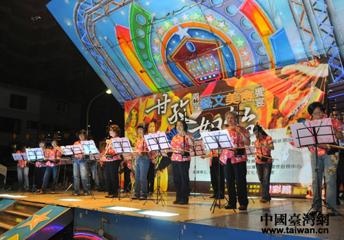 中國臺灣網11月13日高雄消息 日前,四川省民族歌舞赴臺交流團第二場演出在臺灣高雄市三民區義民廟前的空地如約舉行。本場演出除了四川民族歌舞團帶去的節目之外,臺灣同胞也上臺進行了聲樂演奏、舞蹈等表演,兩岸同胞同樂。而演出場地一圈,還有數十個臺灣美食大排檔,當地市民除了可以欣賞文藝表演,也還可以品嘗到當地美食。