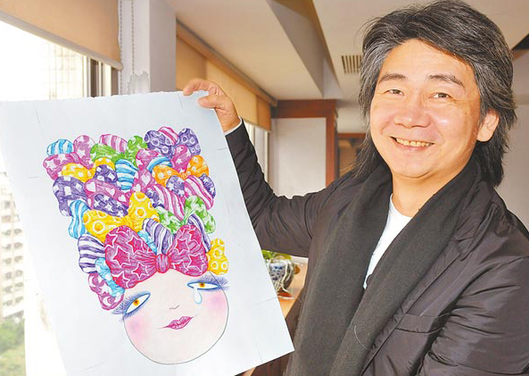 朱德庸手拿最新作品《大家都有病2:跟著笨蛋一起談戀愛》原稿留影。