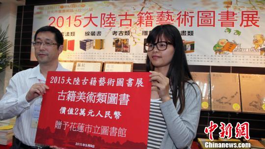 展會開幕當天,大陸書展代表團團長、北京時代聯(lián)信貿(mào)易有限公司副總經(jīng)理崔曉軍向花蓮市立圖書館贈送了天津楊柳青畫社在內(nèi)多家出版社《中國畫技法》等一批古籍美術(shù)類圖書。