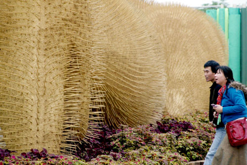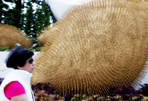 臺北花博新生三館外的裝置藝術作品“漫延”以免洗竹筷制成,長相如同刺猬般,盼民眾省思如何減少砍伐森林樹木,減輕對環境的負擔及傷害。民眾1日路過觀看。圖片來源:“中央社”