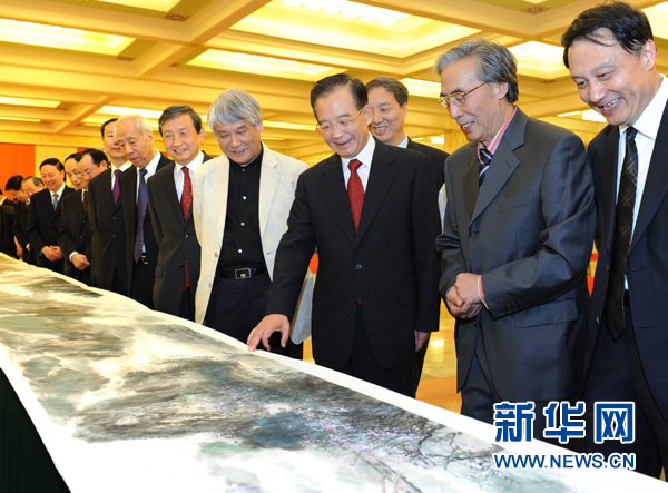 上午9時許,溫家寶總理來到人民大會堂,出席中央文史研究館成立60周年座談會。座談會前,溫家寶在幾位主創畫家的陪同下,興致勃勃地觀賞了這幅巨作。