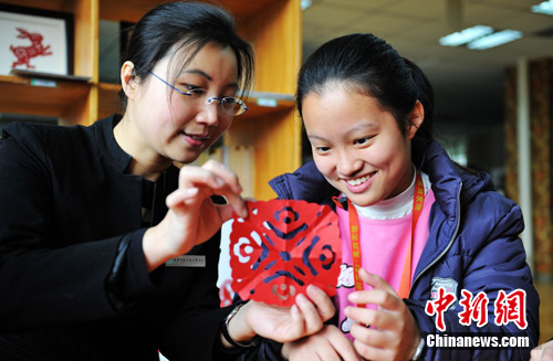 3月18日,“2011海峽兩岸少年兒童科技嘉年華”在四川成都啟動。圖為成都老師正在教臺灣孩子學習民俗剪紙。中新社發(fā) 劉忠俊 攝