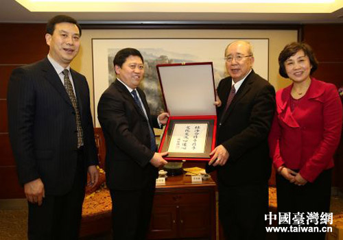 中國國民黨榮譽主席、“世界客屬總會”總會長吳伯雄(右二)贈送他為開封市的題詞。