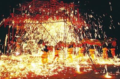 2月17日,確山縣民間藝人手舞龍燈穿梭在飛濺的鐵花之中,迎接農歷羊年的到來。確山鐵花曾一度瀕危,上世紀七八十年代,經過當地文化工作者搶救性挖掘,使之成為全國第二批非物質文化遺產項目。李璞 攝