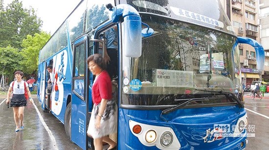5月27日,大陸無錫的高端團(tuán)赴臺(tái),游覽車上還特別標(biāo)明“首發(fā)高端團(tuán)”。資料照片:臺(tái)灣“中時(shí)電子報(bào)”