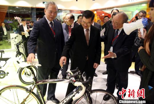 臺灣商品中心1日在上海自貿試驗區正式揭牌營運,兩岸企業家峰會大陸方理事長曾培炎、臺灣方理事長蕭萬長等嘉賓參觀中心。 潘索菲 攝