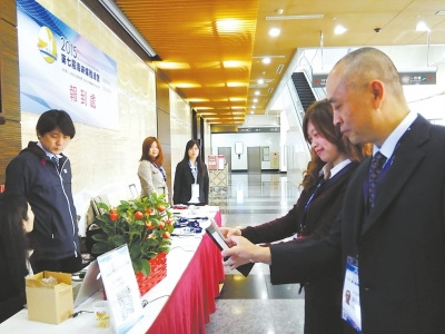 參會嘉賓只要用手機掃下二維碼,就可以直接獲取會議資料。(李向娟 攝)