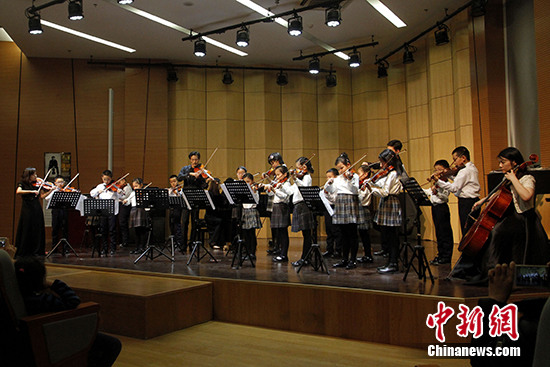 北京ACE音樂教育研究院兒童弦樂團與臺北國際青年演奏家樂團共同演奏臺灣民謠《望春風》。 中新社記者 陳小愿 攝