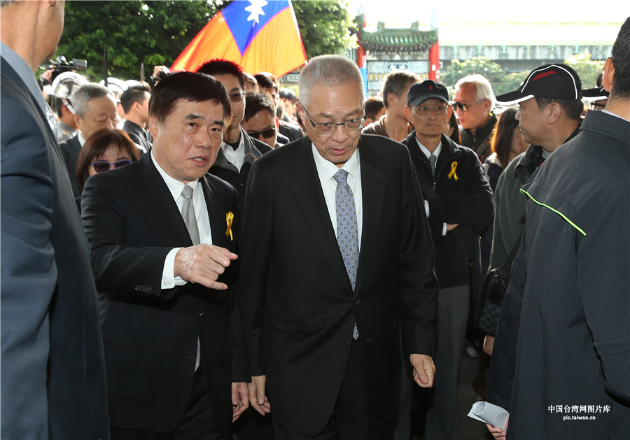 中國臺灣網3月23日訊 臺軍退役上?姷律2月底在反軍人年改抗議中,因在“立法院”攀墻不慎跌落重傷不治,其家人于3月22日上午舉行告別儀式,中國國民黨主席吳敦義(中)、副主席郝龍斌(左)前往致祭。(來源:中國臺灣網圖片庫 攝影:林俊良)