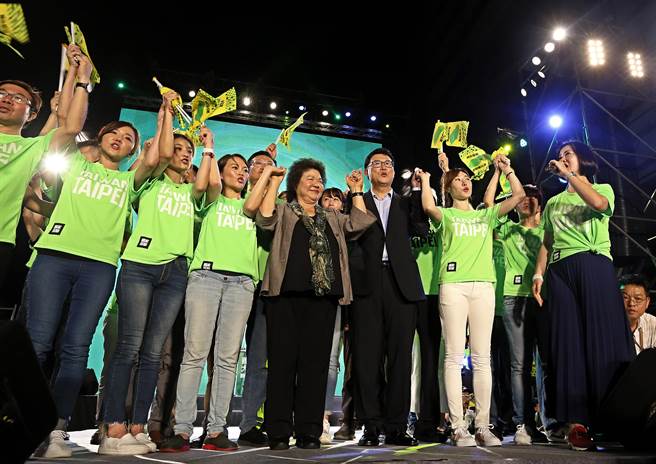 民進(jìn)黨臺(tái)北市長參選人姚文智(右4)23日晚間舉辦首場造勢晚會(huì),凝聚綠營士氣。(圖片來源:臺(tái)灣《中時(shí)電子報(bào)》)