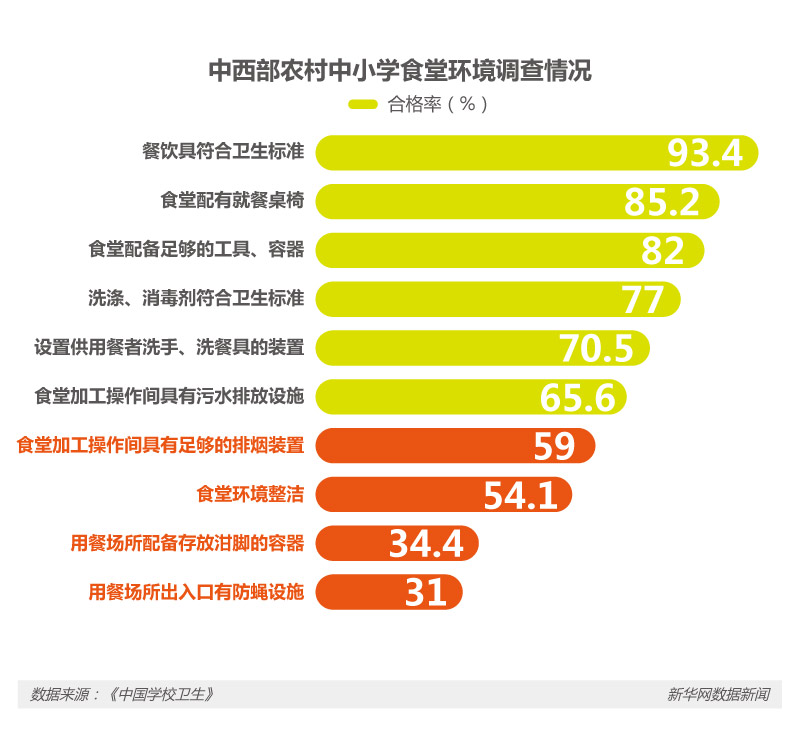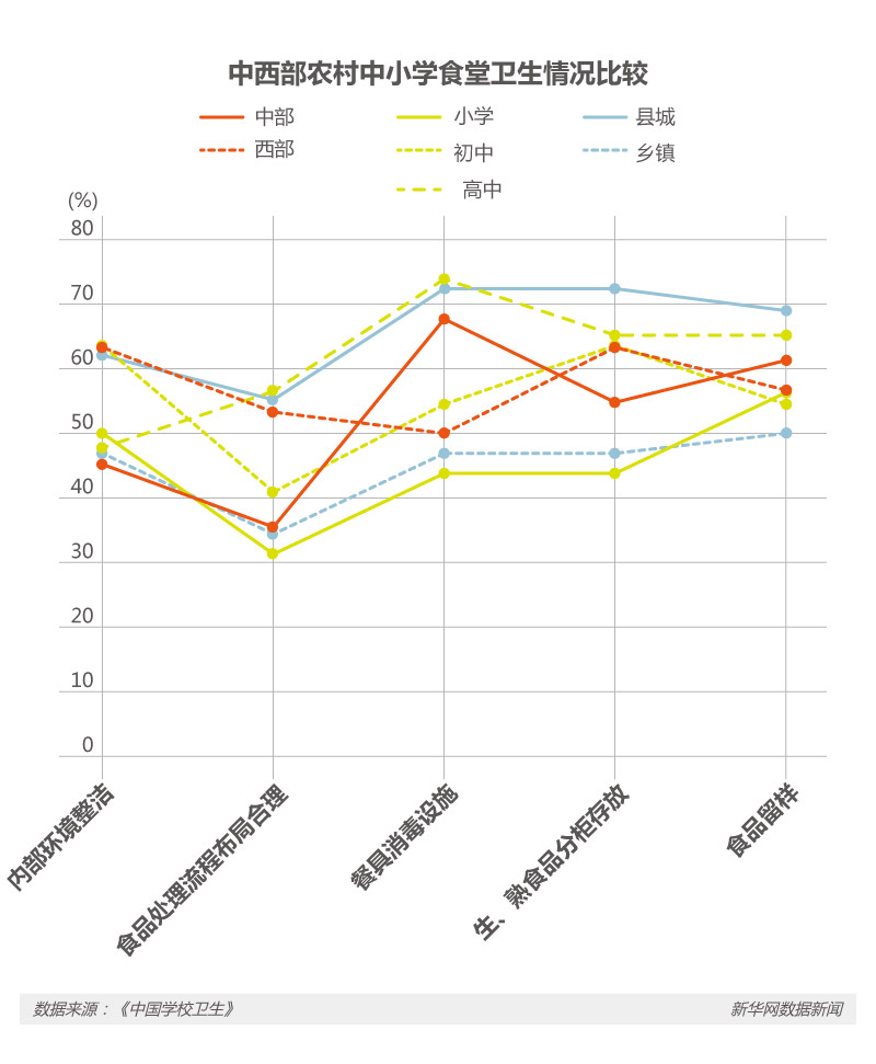 我國中西部農(nóng)村中小學食堂普遍存在衛(wèi)生與管理問題。整體來看,縣城學校的情況要明顯好于農(nóng)村,而中部城市在部分指標卻落后于西部城市,高中學校食堂衛(wèi)生條件整體看要好于小學、初中。