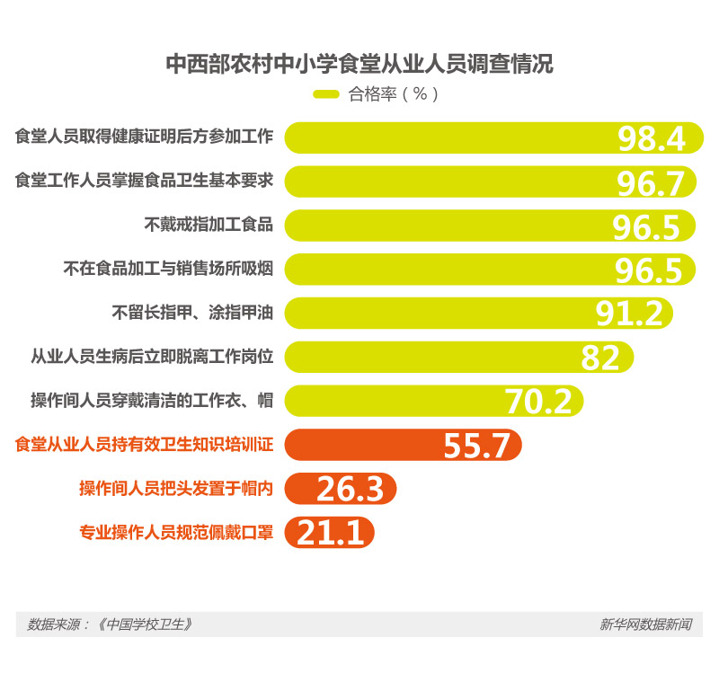 校園食堂環(huán)境衛(wèi)生是否達標,與食堂從業(yè)人員有較大的關系。根據(jù)調(diào)查顯示,中西部農(nóng)村小學食堂從業(yè)人員的衛(wèi)生健康意識還較為欠缺,存在較多不規(guī)范操作行為。
