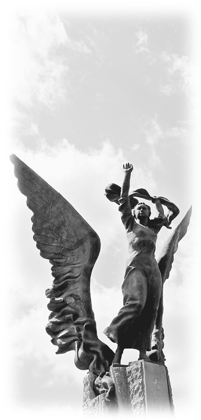 綏芬河市民用青銅為她塑起一座雕像。雕像就立在她最后上山的地方。她站在6米高的基座上,花崗巖形如石崖,嶙峋峭立。熔巖流出石縫,火焰在她身后升騰,化為雙翅,凌空招展。那火焰象征第二次世界大戰的戰火。她揮舞著臨行前媽媽送她的新頭巾……