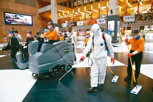 臺軍磐石艦染疫,確診者足跡包含臺北車站等交通要點,圖為臺鐵在清潔消毒。(圖片來源:臺灣《聯(lián)合報》)