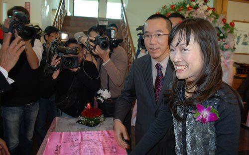 陳水扁兒子陳致中(右2)和妻子黃睿靚(右1)出席妻舅黃漢強(qiáng)的婚禮。圖片來(lái)源:臺(tái)灣“中央社”