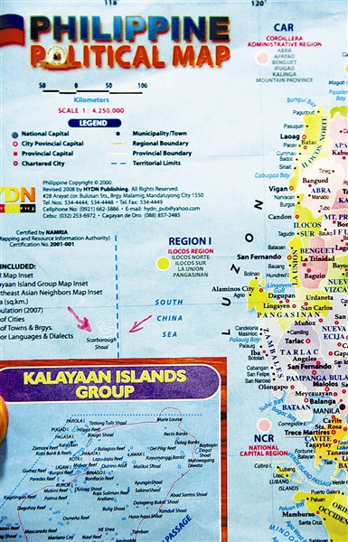 這是一張由菲律賓國家地圖繪制與信息資源總局認證、2008年版的菲律賓行政地圖,圖中將黃巖島(菲方稱Scarborough Shoal,圖中箭頭所指)清楚地標記在東經118度菲律賓的邊界線之外。新華社記者許林貴2009年2月23日攝。本報資料照片
