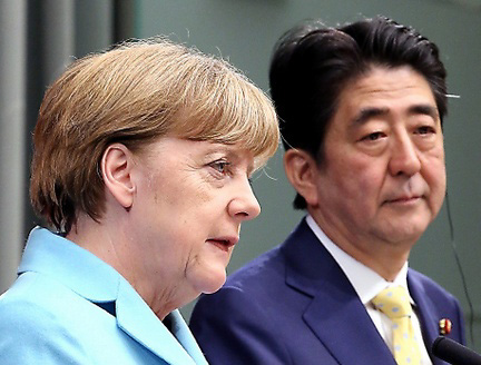 資料圖:日本首相安倍晉三與德國總理默克爾(左)。