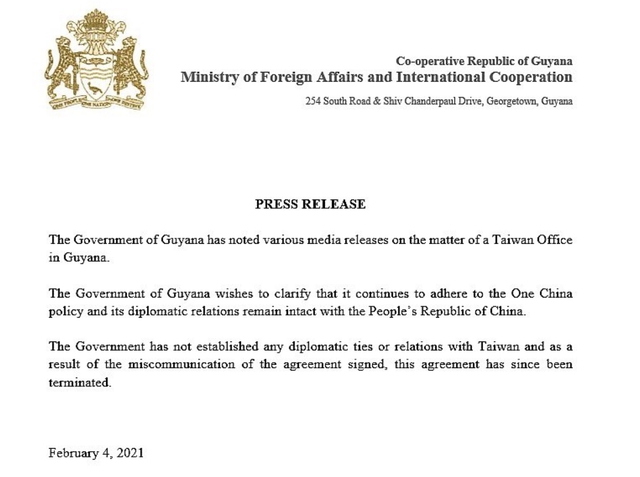 臺(tái)當(dāng)局外事主管部門4日宣布在圭亞那設(shè)立“臺(tái)灣辦公室”,島內(nèi)綠營(yíng)媒體對(duì)此宣揚(yáng)為“外交又一新突破”。然而,他們自嗨不到24小時(shí)就被打回原形。圭亞那外交部隨后回應(yīng)稱,圭亞那政府并未與臺(tái)灣建立任何“外交關(guān)系”,并宣布,基于對(duì)所簽署協(xié)議的“溝通不良”,將終止這項(xiàng)協(xié)議。盡管被圭亞那官方潑了冷水,但是他們還沒(méi)死心。