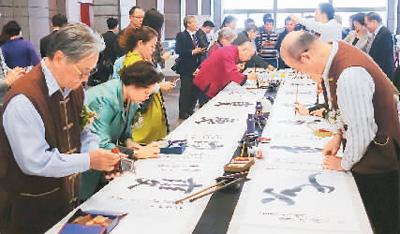 兩岸書法家揮筆共書年度漢字。(圖片來(lái)源:人民日?qǐng)?bào)海外版)