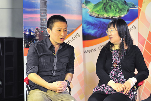 中央人民廣播電臺旅游欄目資深主持人、記者 陳雅萍(右)、曾單車騎行環島,赴臺個人游達人 汪振(左)做客中國臺灣網,談赴臺游感受心得。