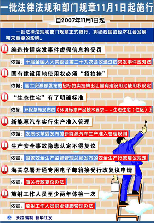 新華網(wǎng)北京10月31日電(記者 田雨)自11月1日起,突發(fā)事件應(yīng)對(duì)法 等一批法律法規(guī)和部門規(guī)章正式施行,將給我國(guó)的經(jīng)濟(jì)社會(huì)發(fā)展帶來(lái)重要的影響。