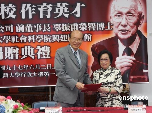 六月二日上午十時(shí),臺(tái)灣大學(xué)在第一行政大樓第一會(huì)議室,舉辦“關(guān)懷母校,作育英才——臺(tái)灣水泥股份有限公司前董事長(zhǎng)辜振甫榮譽(yù)博士捐贈(zèng)臺(tái)灣大學(xué)社會(huì)科學(xué)院興建圖書館捐贈(zèng)典禮”。辜振甫先生的遺孀辜嚴(yán)倬云率子女出席典禮,并以辜振甫的名義,捐贈(zèng)一億元新臺(tái)幣給臺(tái)大興建社科院圖書館。