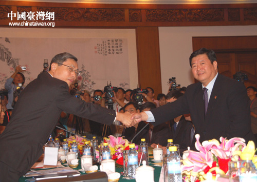 今天上午,海協(xié)會與;鶗蛢砂吨苣┌鼨C(jī)議題進(jìn)行協(xié)商。這是海協(xié)會執(zhí)行副會長孫亞夫與海基會副董事長兼秘書長高孔廉在協(xié)商前握手。(攝影:中國臺灣網(wǎng) 田云鵬)