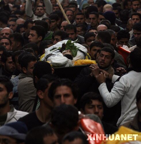 1月17日,在加沙地帶北部,巴勒斯坦人為以色列空襲中的遇難者舉行葬禮。以色列安全內(nèi)閣當(dāng)晚投票決定,在加沙地帶實(shí)行單方面停火。以色列自去年12月27日向加沙地帶發(fā)動大規(guī)模軍事打擊,至今已造成超過1200名巴勒斯坦人死亡,超過5300人受傷。 新華社記者納賽爾攝
