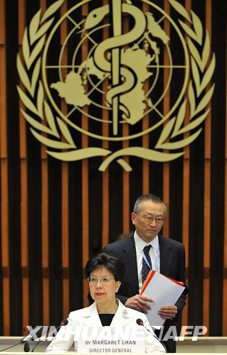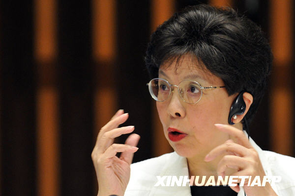 6月11日,世界衛(wèi)生組織總干事陳馮富珍在新聞發(fā)布會上。當日,世界衛(wèi)生組織總干事陳馮富珍正式宣布把甲型H1N1流感警戒級別升至6級。新華社/法新