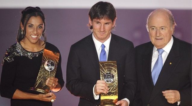 梅西(中)加冕世界足球先生,瑪塔(左)連續(xù)第四次當(dāng)選世界足球小姐。國際足聯(lián)主席布拉特與他們合影。