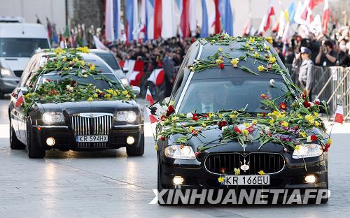4月18日,在波蘭南部城市克拉科夫,運送已故總統(tǒng)卡欽斯基及其夫人靈柩的汽車駛過大街。卡欽斯基夫婦的葬禮于當?shù)貢r間18日下午2時至6時在波蘭南部城市克拉科夫舉行。新華社/法新