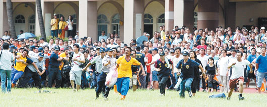 臺灣救援直升機昨天陸續(xù)載出高雄縣小林、六龜災區(qū)村民,在旗山中學守候的家屬等不及直升機降落就往前沖,警察連忙緊追攔人。圖片來源:臺灣《聯(lián)合報》