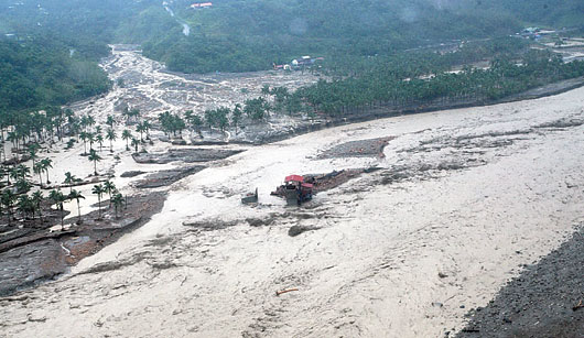 臺軍10日派出直升機進入小林村空域,從空中俯瞰滿村盡是滾滾泥石流,僅見零星的房舍屋頂。圖片來源:臺灣《聯(lián)合報》