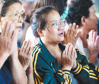 等不到親友安全歸來的焦急民眾,昨天在高雄縣旗山中學與慈濟義工合十禱告。圖片來源:臺灣《聯(lián)合報》
