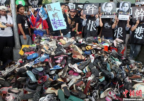 9月29日,雖然中國國民黨推遲了原本決定今天在臺北“國父紀念館”舉行的第19次全代會。但臺灣關廠工人連線等民間社團下午仍按原計劃在“國父紀念館”周圍展開“萬人威鞋、募鞋”活動,訴求民眾生活痛苦得不到改善,以砸鞋、丟鞋的方式表達不滿。 陳立宇 攝
