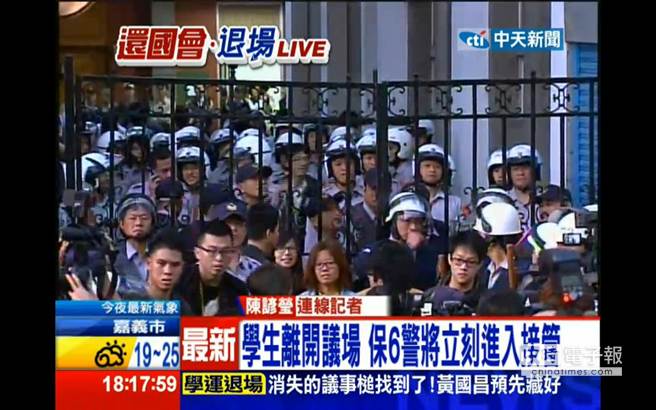 學(xué)生離開(kāi)議場(chǎng),警察立刻進(jìn)入接管。(圖片來(lái)自臺(tái)媒)