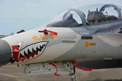 為紀(jì)念對(duì)日抗戰(zhàn)勝利七十周年,臺(tái)防務(wù)部門(mén)于新竹空軍基地舉行“空軍紀(jì)念圖騰彩繪戰(zhàn)機(jī)”媒體參訪活動(dòng)。在F-16戰(zhàn)機(jī)機(jī)身展示彩繪,復(fù)刻二戰(zhàn)時(shí)期“飛虎隊(duì)”鯊魚(yú)頭涂裝,機(jī)身上可見(jiàn)“太公令”字樣與5面日本國(guó)旗,象征擊落的5架日機(jī),并紀(jì)念已故抗戰(zhàn)英雄徐華江將軍。(臺(tái)媒圖)