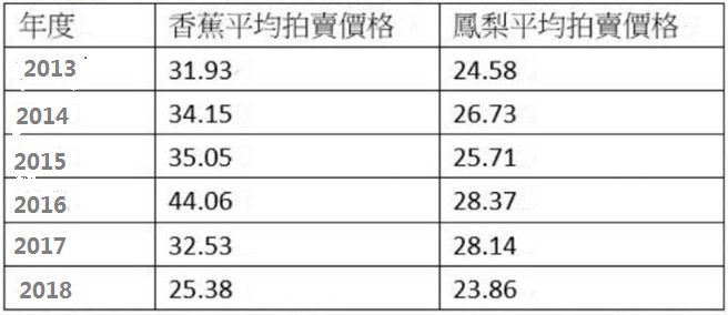 北農近年來拍賣香蕉、菠蘿平均價格。(數據源:臺北農產運銷公司 單位:元新臺幣/每公斤)
