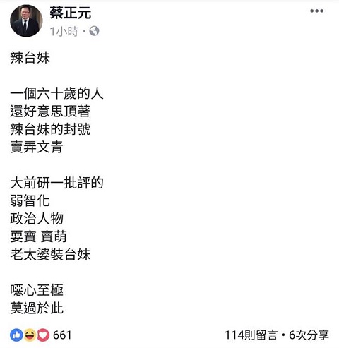 蔡正元近來頻頻發文,今日在臉書表示:“辣臺妹,一個六十歲的人,還好意思頂著,辣臺妹的封號,賣弄文青。大前研一批評的,弱智化,政治人物。耍寶、賣萌,老太婆裝臺妹,惡心至極,莫過于此。”