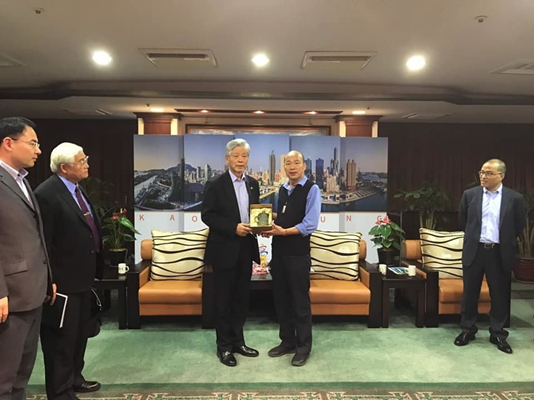 高雄市副市長葉匡時19日在臉譜網(wǎng)(facebook),貼出由春秋集團董事長王正華領(lǐng)隊,拜訪高雄市長韓國瑜,雙方互贈紀念品的照片,王正華表示,希望兩岸航空主管機關(guān)能早日協(xié)商予以支持。