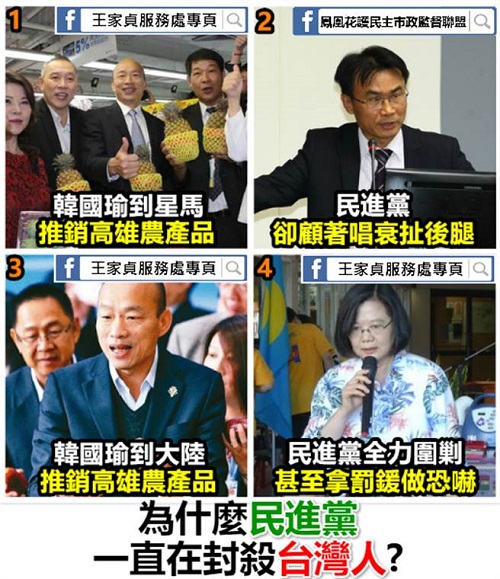 “鳳凰花護(hù)民主市政監(jiān)督聯(lián)盟”在臉書(shū)指出,韓國(guó)瑜到新馬推銷高雄農(nóng)產(chǎn)品,民進(jìn)黨卻顧著唱衰扯后腿;韓國(guó)瑜到大陸推銷高雄農(nóng)產(chǎn)品,民進(jìn)黨全力圍剿甚至拿罰款做恐嚇,“為什么民進(jìn)黨一直在封殺臺(tái)灣人?”