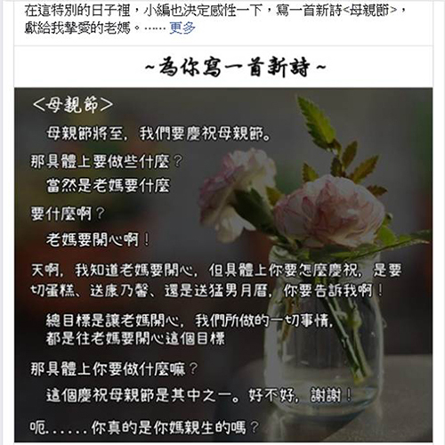 “內(nèi)政部”昨日為慶祝母親節(jié),臉譜網(wǎng)粉絲團(tuán)小編特地發(fā)出新詩(shī)慶祝,全文如下:母親節(jié)將至,我們要慶祝母親節(jié)。那具體上要做些什么?當(dāng)然是老媽要什么。要什么啊?老媽要開(kāi)心啊!天啊,我知道老媽要開(kāi)心,但具體上你要怎么慶祝,是要切蛋糕、送康乃馨,還是送猛男月歷,你要告訴我啊!總目標(biāo)是讓老媽開(kāi)心,我們所做的一切事情,都是往老媽要開(kāi)心這個(gè)目標(biāo)。那具體上你要做什么嘛?這個(gè)慶祝母親節(jié)是其中之一。好不好,謝謝!呃……你真的是你媽親生的嗎?