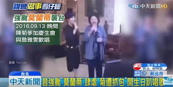 高雄前市長陳菊,2016年的強臺風“莫蘭蒂”過境時高雄災情嚴重,她晚上卻參加朋友慶生會,還和臺灣歌手詹雅雯開心唱歌。(圖片取自臺媒)