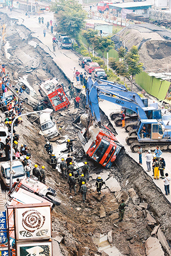 2014年8月1日,高雄前鎮區凌晨發生傷亡慘重的氣爆,發生爆炸的凱旋二路,宛如經過戰火洗禮般,停在路邊的消防車也成了受害者。(圖片來源:臺灣“中時電子報”)