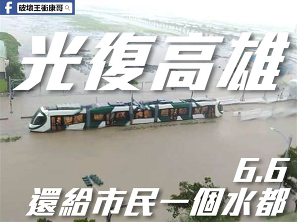 臉譜網(facebook)粉絲專頁“破壞王沖康哥”昨日在粉絲團發文諷刺,“水上樂園不好嗎?水上輕軌不好嗎?過去,高雄淹的不只是水,淹的是滿溢的臺灣價值!自從國民黨奪走高雄之后,連臺灣價值都消退了!這不是我們愛的高雄,更不是幸福之都!”附圖可見當時8/23高雄夢時代購物中心周邊因嚴重積水,出現輕軌在水上行駛的照片。其他網友也紛紛開酸,“6.6之后就不會淹水了更不會積水,地永遠是干的”“營造一個水都樂園, 要付出多少年心思”。(中國臺灣網 李寧)