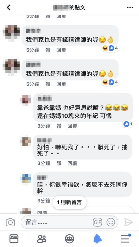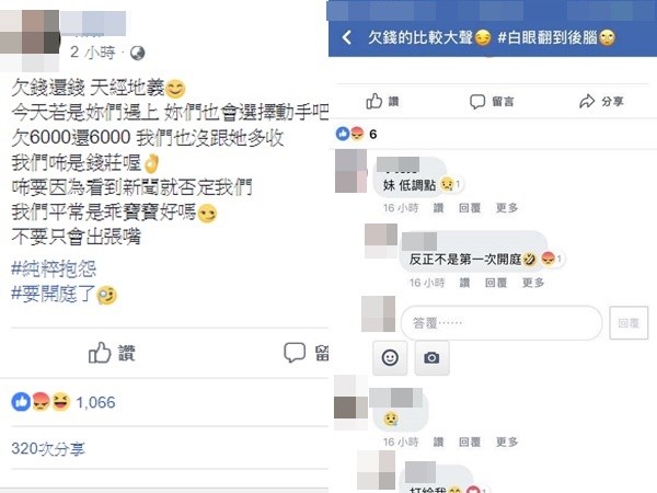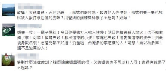 事后,其中一名霸凌女子在臉譜網(wǎng)貼文指出,欠錢還錢,天經(jīng)地義,今天若是你們遇上,你們也會選擇動手吧,欠6000還6000,我們也沒跟她多收,我們不是錢莊喔,不要因?yàn)榭吹叫侣劸头穸ㄎ覀儯覀兤匠J枪詫殞毢脝幔灰粫鰪堊臁YN文引來眾多網(wǎng)友圍剿,可是女子卻反嗆“我們家也是有錢請律師的喔。”