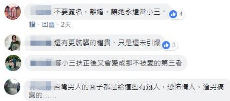 對此,臺灣網(wǎng)友表示:“不要離婚,讓她永遠(yuǎn)當(dāng)小三”“等小三被扶正后又會變成那不被愛的第三者”“臺灣男人的面子都是給這些有錢人、恐怖情人、渣男搞臭的”。