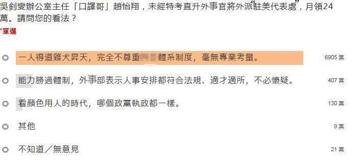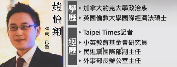 另一曾當(dāng)過“政治組長”的前“駐美代表”沈呂巡直言,1993年他任此職時(shí),已在外事部門工作戮力了11年,而一般外事官有些就算做了11年都還不一定能出任“政治組長”這樣的職務(wù),“請問趙怡翔在外事部幾年?這個(gè)任命對(duì)基層同仁很不公平”。