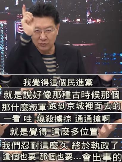 政論節(jié)目主持人趙少康忍不住嘲諷完全執(zhí)政后的民進(jìn)黨當(dāng)局“像古時(shí)候叛軍進(jìn)京似得,燒殺擄掠,統(tǒng)統(tǒng)都搶”,更警告蔡當(dāng)局“會(huì)出事的”!